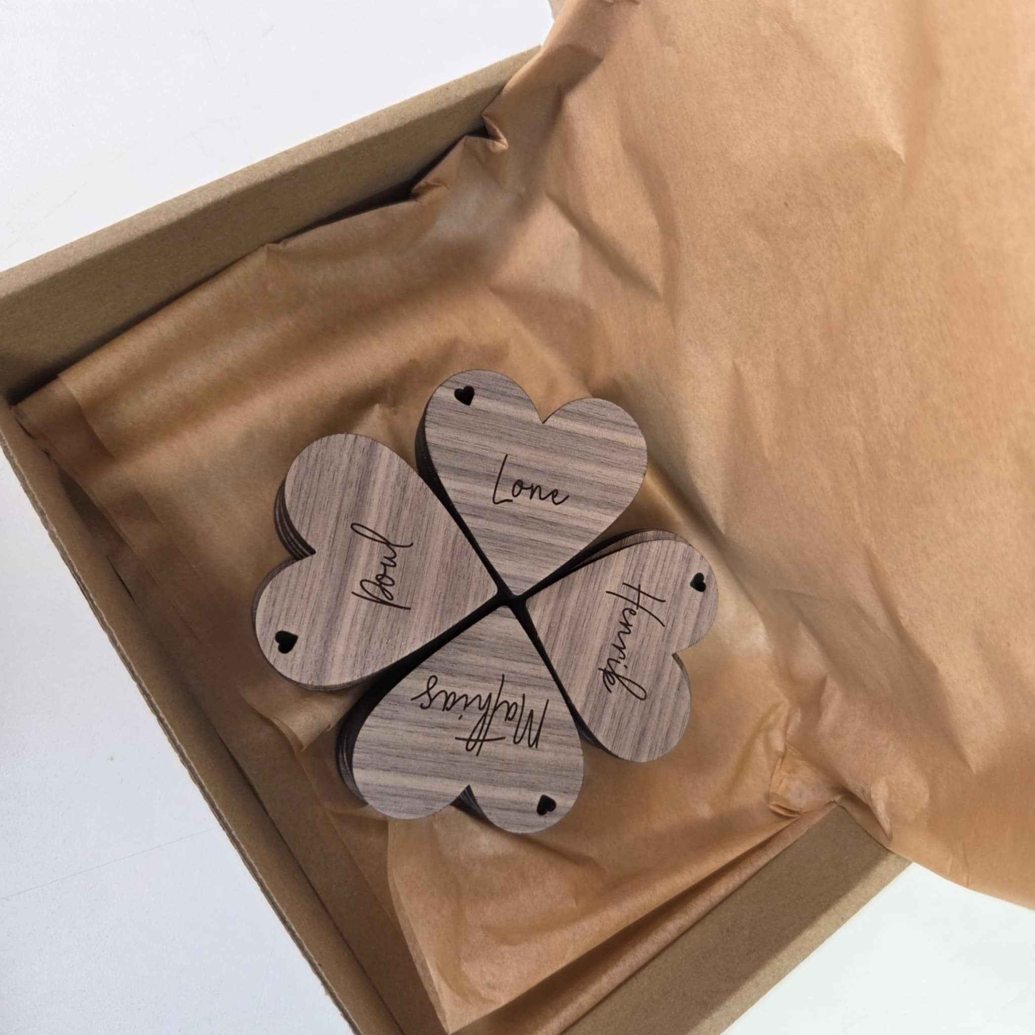 Våra placeringskort i trä med hjärtan är inte bara praktiska, de är små konstverk. Förutom att gravera era namn har vi även möjlighet att inkludera era gästers namn, vilket ger en personlig touch till er bordsdukning. Välj mellan olika träslag som passar ditt bröllopstema och stil. Varje hjärtformat placeringskort är skapat med omsorg och precision, och de kommer att bli ett oförglömligt minne från er stora dag som era gäster kan ta med sig hem.