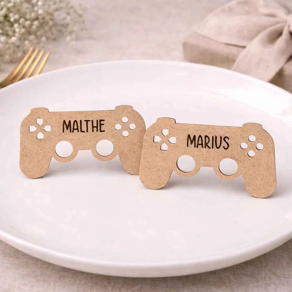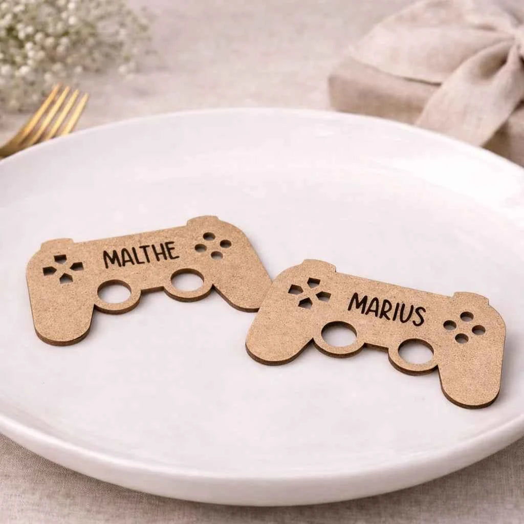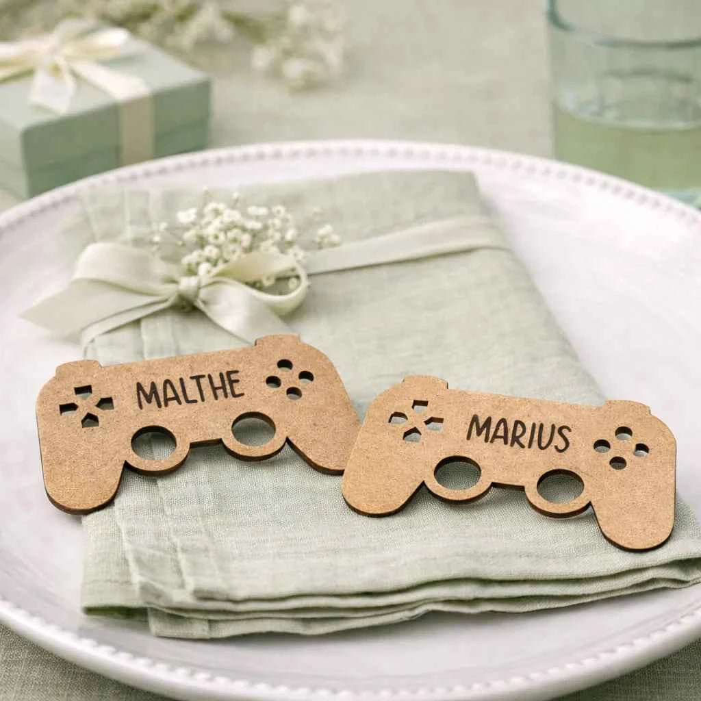 Gør borddækningen personlig med bordkort i træ med navn i gamer controller-design. Hvert bordkort skæres i MDF og tilpasses med gæstens navn, så hver plads ved bordet er tydeligt markeret og passer til et gennemført gaming-tema.
