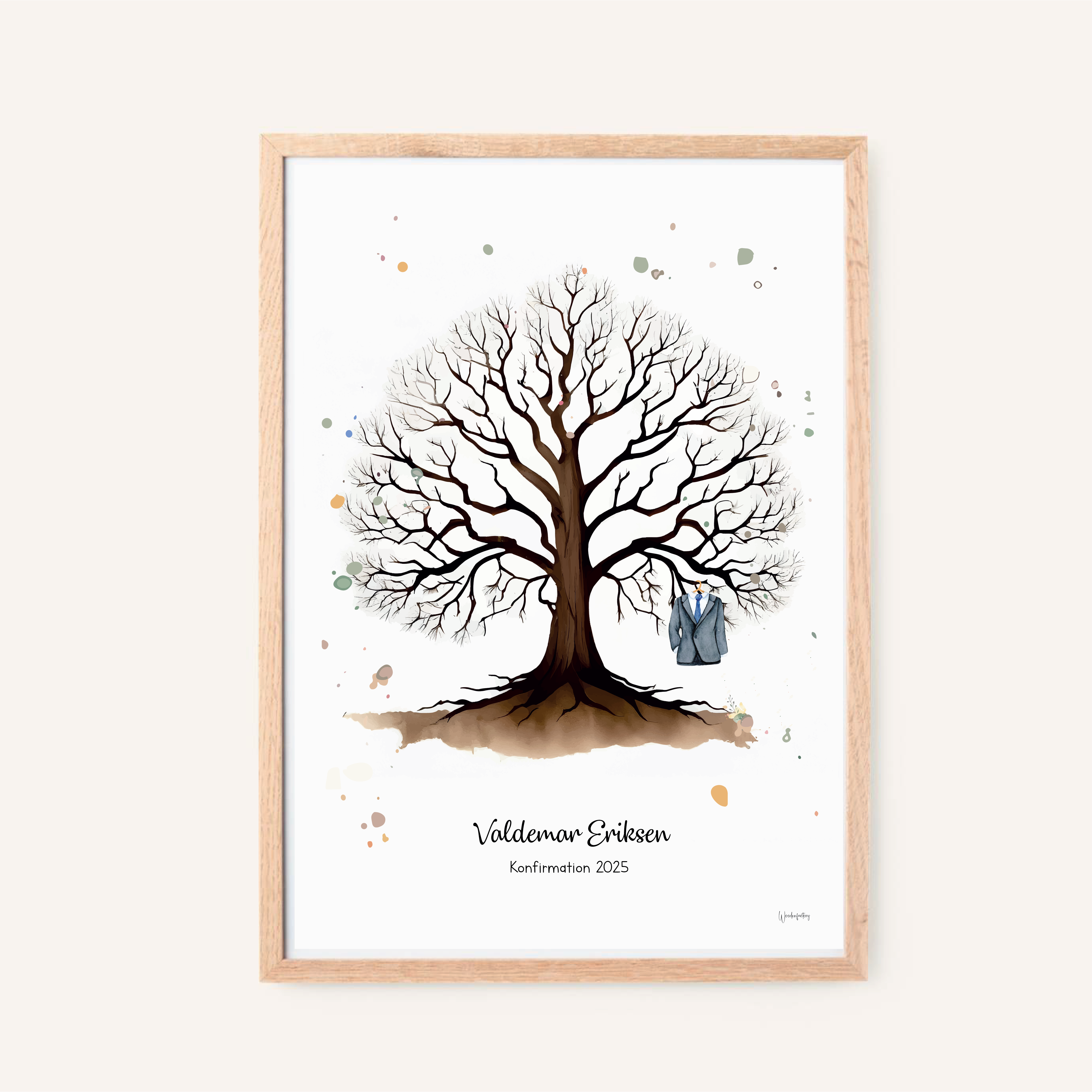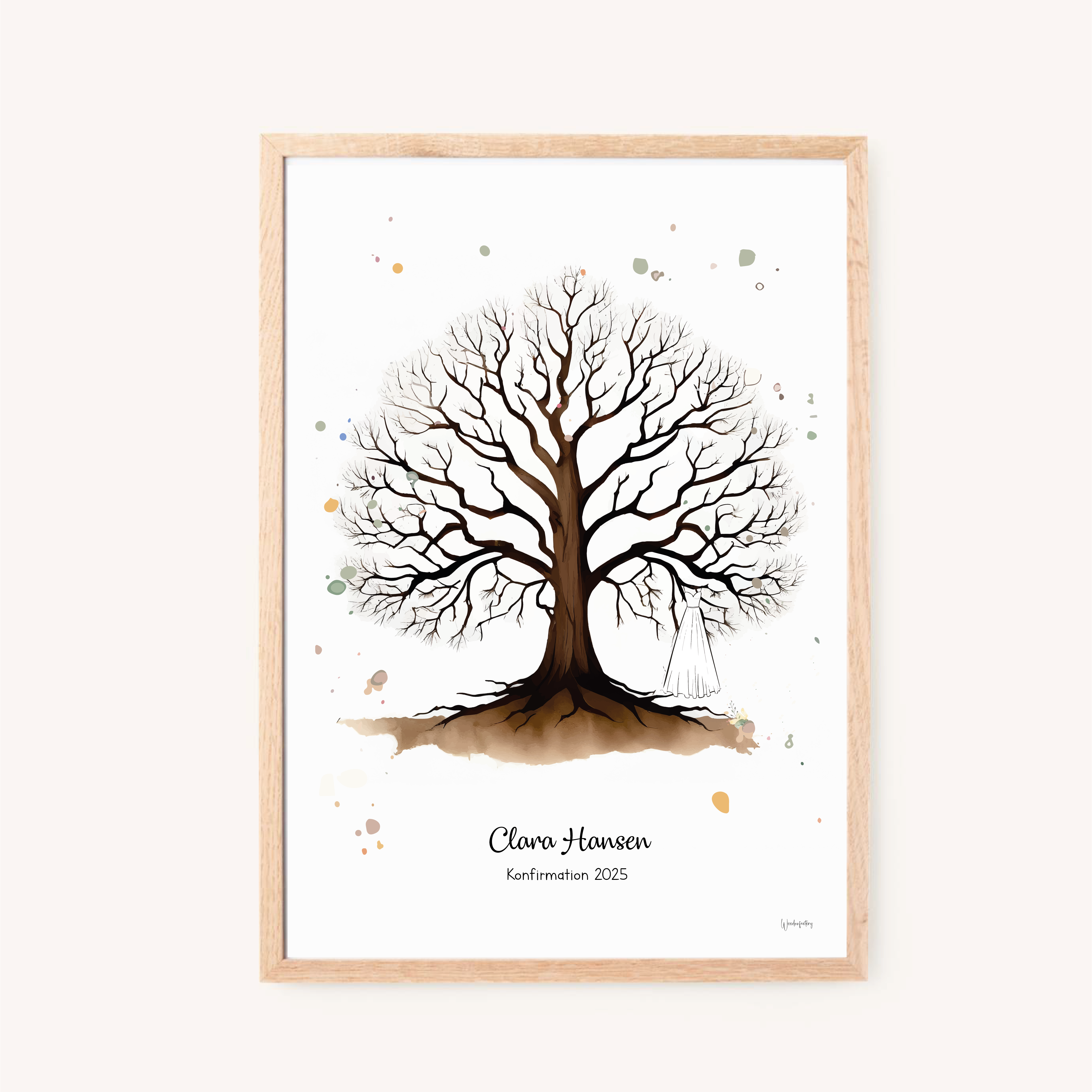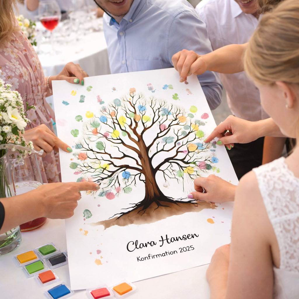 Vår konfirmationsaffisch är en interaktiv upplevelse där dina gäster kan sätta sin personliga prägel genom att lägga sina fingeravtryck som löv på trädets grenar. Varje avtryck blir en del av det vackra mönstret som symboliserar gemenskapen och kärleken som omger konfirmanden.